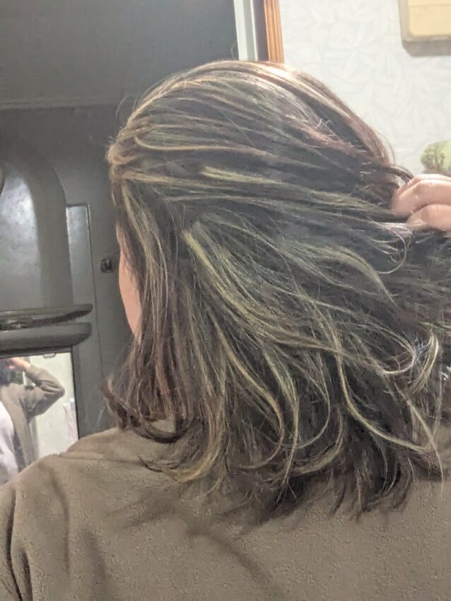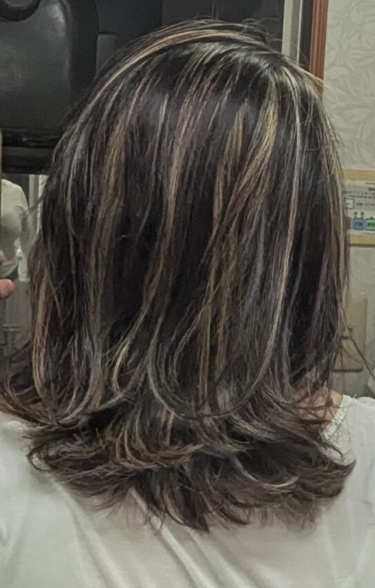 ただ、後悔があります。額の右側に白髪が目立ったように私には見えました。私は、「ここもどうにかしてください」と言ったら、美容師さん、「線が太くなってギャルっぽくなりますよ?」と言われたけど、その部分がどうしても気になって、私はそれでも良いからやって、と。