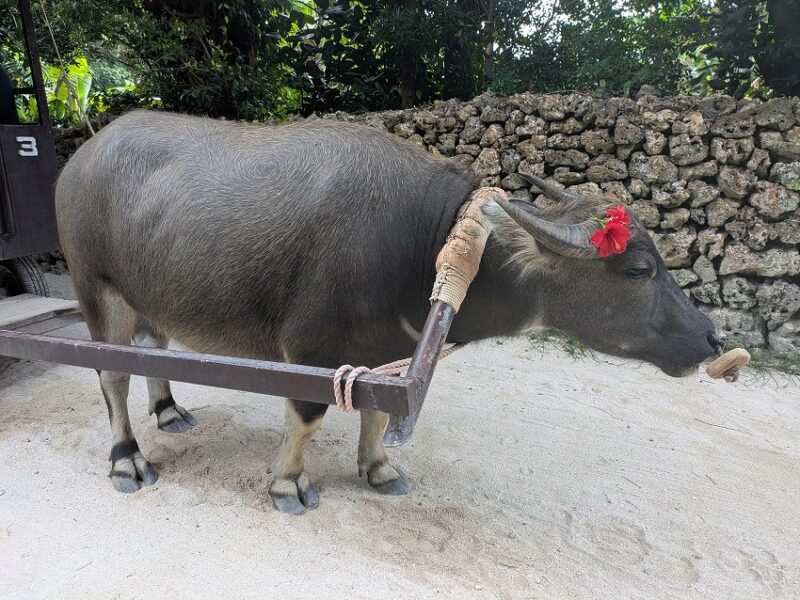 おお~、これが赤屋根の南の島だ~。と言わんばかりの集落。そして、そこをゆっくりと水牛車が案内してくれるみたい。私は、ここでは水牛車には乗りませんでしたが。
